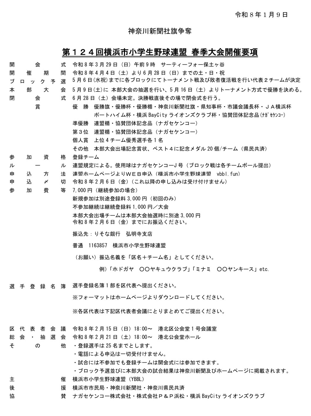 第124回YBBL春季大会の申込は2026年1月14日(水)からホームページの大会情報欄から開始されます。